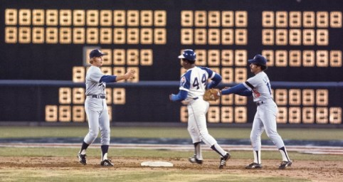 As “715” blasted in neon on the scoreboard way behind them, the entire Dodger infield—including shortstop Bill Russell (left) and second baseman Davey Lopes—shook hands with Henry Aaron rounding the bases and past Babe Ruth at last.