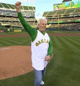 Vida Blue (right) with catcher/first baseman Gene Tenace, at a 40th anniversary celebration of Oakland’s first of three straight World Series championships.