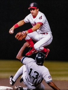 Omar Vizquel leaping over Charlie Hayers to avoid getting clobbered while possible thinking double play turn in 1997.